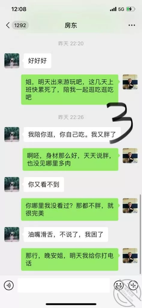 我是不是好久都没更新小搔房东的进度了,请大家原谅,最近全国疫情动不动就封,抓紧时间多挣点钱,所以没心情把这个事放在心上,有一下没一下的吸引一下,可能我不在家,见面少,就生疏了吧,发信息也不怎么吊我 ,一般想必她寂寞了可能才会搭理我一下,我有点吃不准,这娘们到底是想被我干,还是不想呢?