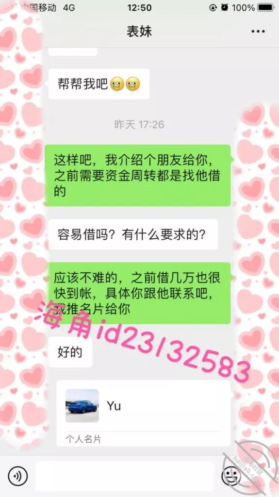微信小号加了表妹之后她说想借1万,我问她有没有房子车子和工作社保,这属于明知故问让她跟着我的节奏走,然后引导她拍果贷视频给我,之后她就没有回复我了,希望她找不到其他人借钱吧