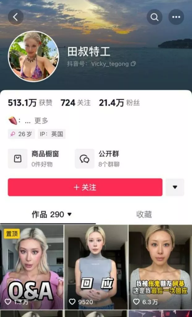 在抖音上拥有21万粉丝的女网红田叔特工,自我塑造的形象是一位在英国留学的富家千金。然而,事实上,她所有的财富都来自于男友。在与男友长达六年的恋爱关系中,她花费了高达1300万元。更令人震惊的是,男友发现这位伪装的千金在私下里与数十名男性发生不正当关系,并拍摄了大量不雅视频。愤怒之下的男友决定将她告上法庭,以维护自己的权益。