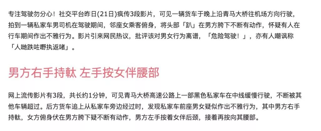 在香港青马大桥上,一辆黑车正朝着机场的方向行驶。车内,一对男女的举动引人注目——他们竟然在开车时进行亲密行为,女子更是在副驾驶位置上为司机提供👄交。路过的货车司机对此全程进行了拍摄。这种解压方式是否显得有些过于离谱呢?
