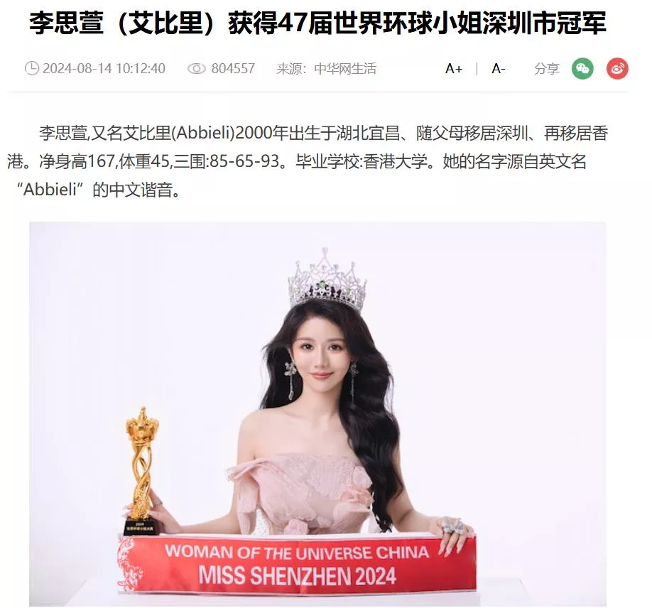 2024世界环球小姐大赛深圳市冠军李思雅,被誉为迄今为止内地最有实力的冠军小姐,有着哥伦比亚大学学位证书以及香港大学学历,但最近却被支出存在学历造假行为,目前已经被检方带走调查。