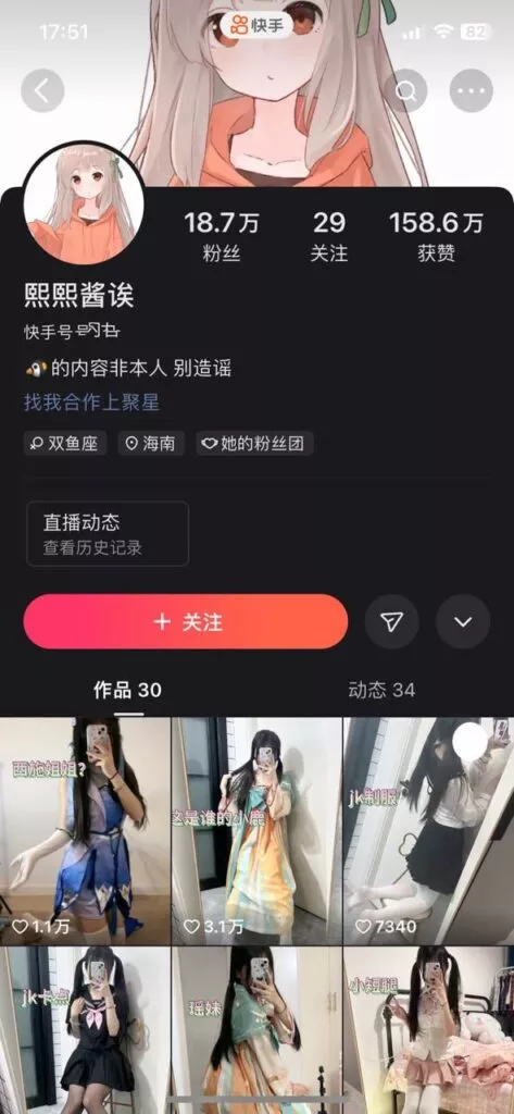 快手拥有19万粉丝的二次元清纯LL熙熙酱近日被曝出黑料。她曾以“福利姬”的身份成功转型,如今在快手上发布各种擦边视频,其中还曝光了大尺度的露面自愉视频。