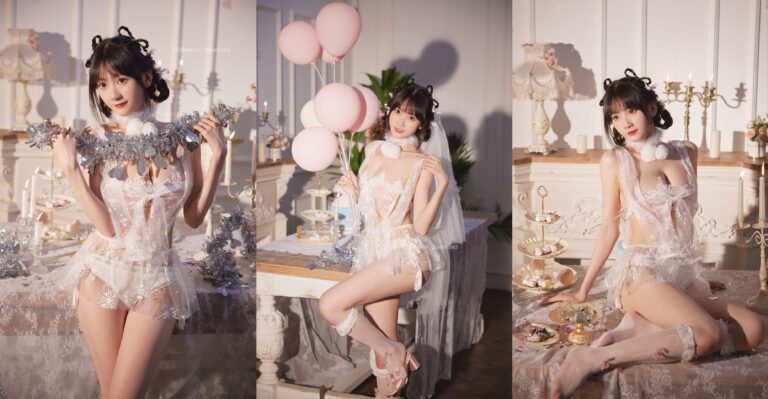 她身着轻薄的白色吊带裙,肩上披着飘逸的纱质面纱,如同一个梦幻中的仙子,美丽而神秘。精致的发型和细腻的妆容配合着她的每一个动作,散发出温柔又不失诱惑的气息,让人忍不住想要一探究竟。