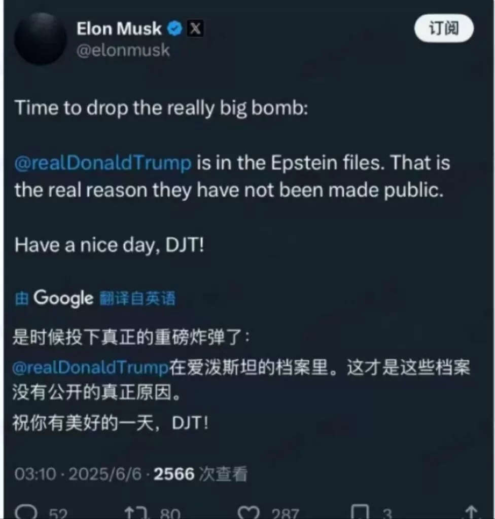 6月4日,马斯克反击,说自己在2024年大选时为特朗普砸了2.5亿美元,现在被翻脸不认人。他还抛出更猛的料,暗示特朗普和爱泼斯坦有染(性犯罪者杰弗里·爱泼斯坦相关的档案,暗示特朗普涉及其中。就是那个做i岛,自行搜索吧。),甚至喊话国会弹劾。