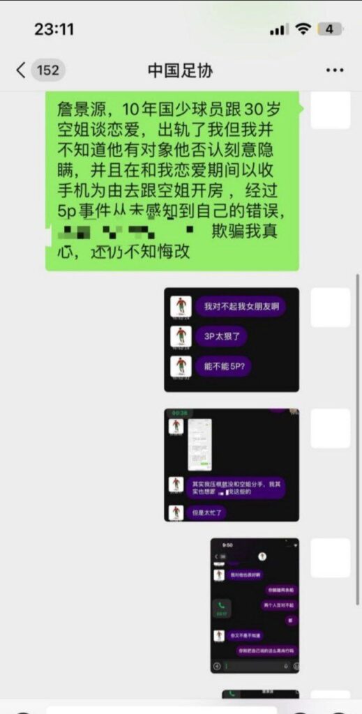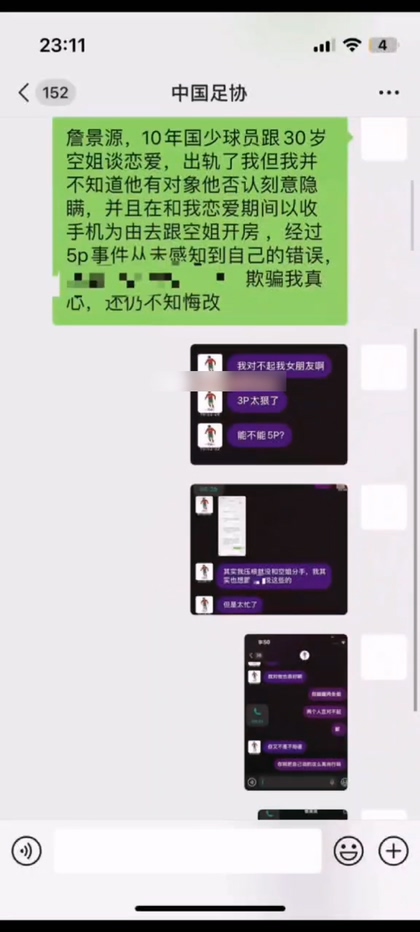 内地体坛迎来重磅核弹级爆料,国足15青年队天才球员詹景源被曝出逆天丑闻,与女友交往期间脚踏多只船,奉行先上再谈原则,甚至被传出私会32岁空姐搞了一场5人混战,其女友在多次劝说无果下,晒出实锤证据整治渣男。